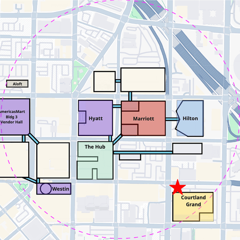 Quiet rooms or designated spaces for attendees who need to escape the noise and sensory overload of the convention are available in the Courtland Grand, Hyatt Regency, & Marriott Marquis.
