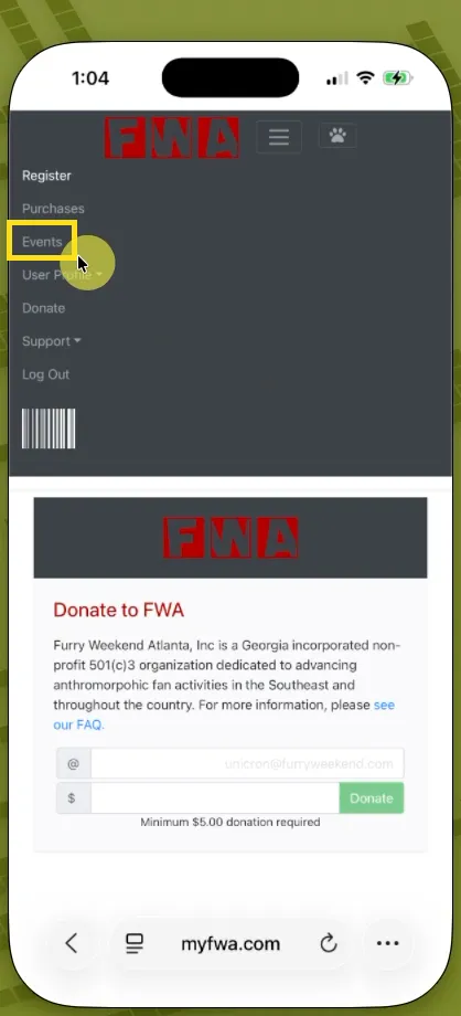 Sign in to your myFWA account. In the menu bar at the top of the page, click the “Events” button.