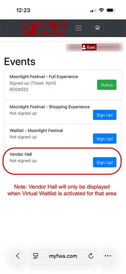The Virtual Waitlist is accessible through your myFWA account from any web browser, no app download required. Every registered FWA attendee already has a myFWA account. Simply log in at any time to check your queue status and position.