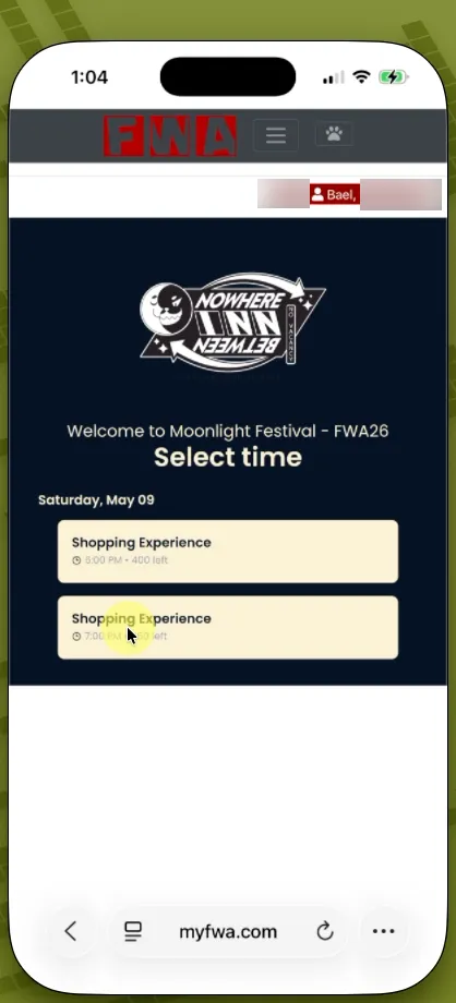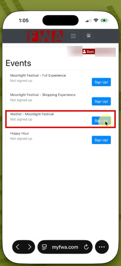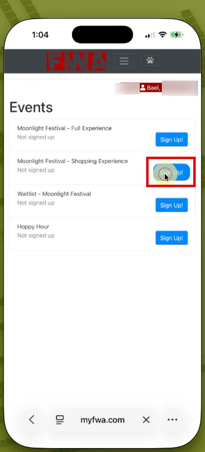 On the day of Moonlight Festival, sign in to your myFWA account and click the “Events” tab in the menu bar.