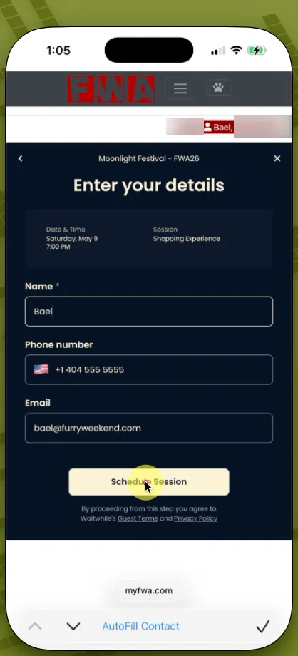 Your Furry Name and Contact Information will be pre-populated from your myFWA profile. You will have the option to update your phone number (US or international) or email address to receive an alert when it’s your turn to join the line. You will be able to check your place in the waitlist on the status page in your browser, but we strongly recommend providing contact information so you don’t miss your window.