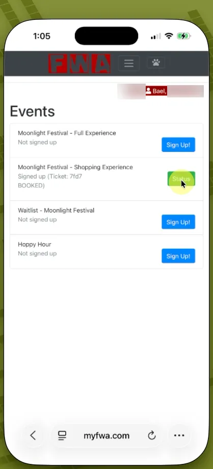 Once your ticket is confirmed, navigate back to the Events tab in myFWA. You will now see a green “Status” button next to Moonlight Festival. Click this to access your confirmation page and the QR code you will present at entry.
