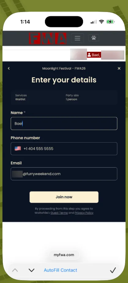 When you join the Virtual Waitlist, you have the option to provide your phone number or email address to receive notifications when it’s your turn. If you prefer not to share that information, you can simply check your status by logging into myFWA directly, no phone number or email required.